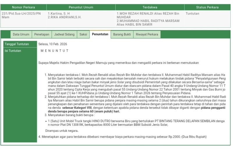 Mamuju — Jaksa Penuntut Umum (JPU) menuntut dua terdakwa kasus penyalahgunaan pengangkutan dan/atau niaga bahan bakar minyak (BBM) jenis solar bersubsidi di Pengadilan Negeri Mamuju, Selasa (10/2/2026).