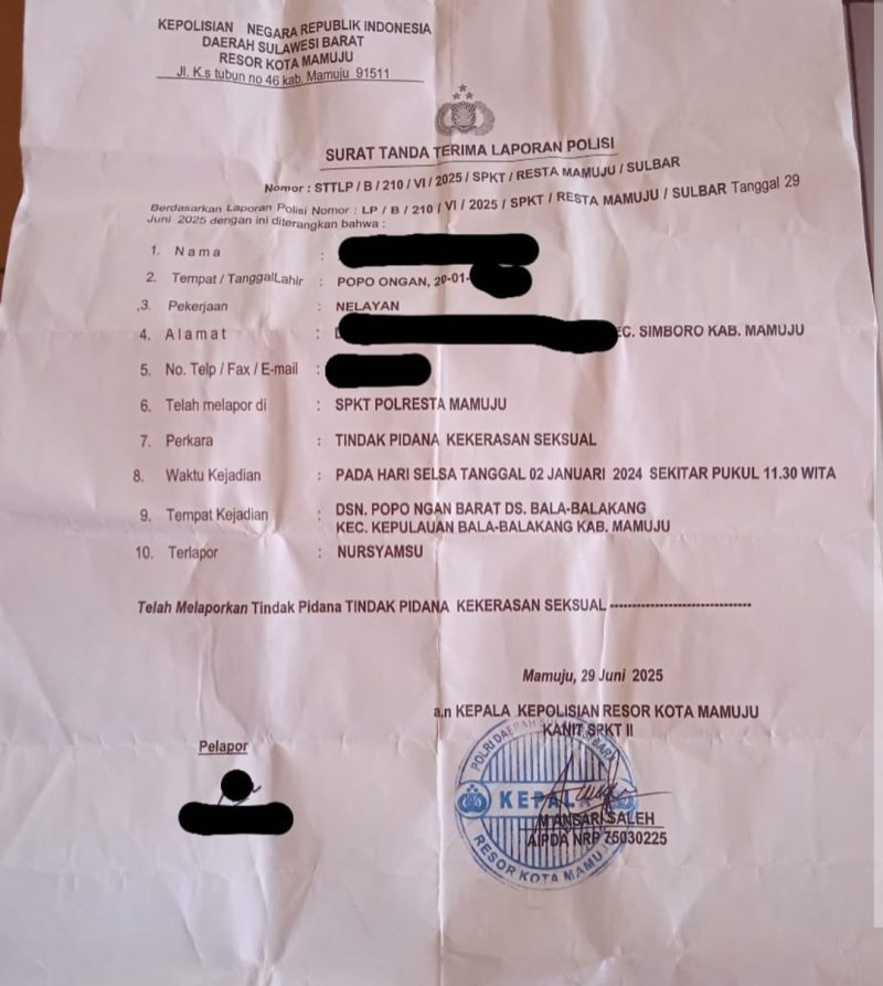 Suarasulbar.id, Mamuju – Warga Pulau Balabalakang, Kabupaten Mamuju, digemparkan dengan kasus dugaan kekerasan seksual terhadap anak di bawah umur yang menyeret seorang tokoh masyarakat setempat. Kasus ini mencuat ke permukaan setelah dilaporkan ke pihak kepolisian dengan nomor laporan LP/B/201/VI/2025/SPKT/RESTAMAMUJU/SULBAR, tertanggal 29/625.