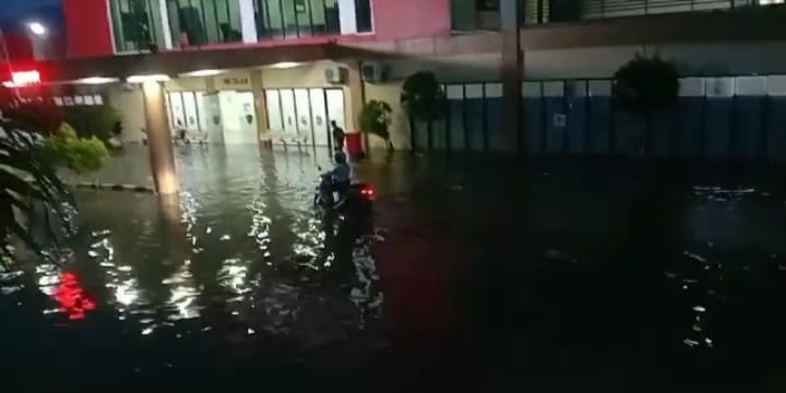 Suarasulbar.id. Mamuju | Rumah Sakit Bhayangkara Hoegeng Imam Santoso di Jalan Veteran kelurahan Simboro, Kecamatan Simboro, Kabupaten Mamuju, Sulbar, Terendam Banjir Rob. Sabtu, (16/24)